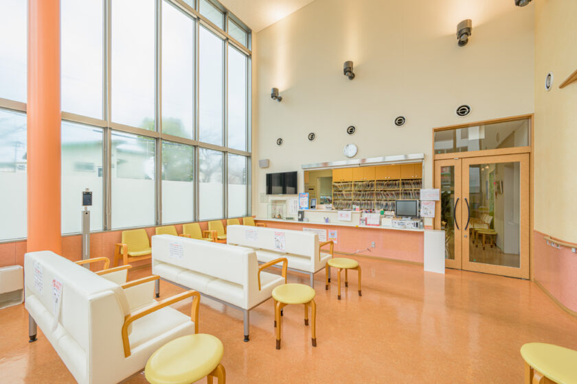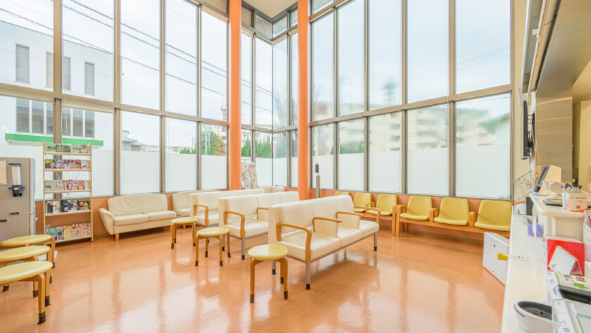 天井まで届く大きな窓のある吹き抜けの明るい待合室で、皆様をお迎えいたします。ウォーターサーバー・本、雑誌などもご用意しております。